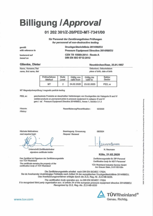 Befähigte Person zur Prüfung von Druckbehältern und Rohrleitungen gemäß 1303 BetrSichV-Schweißfachmann-ZFP RT-2/VT 2/PT 2/ MT 2